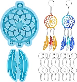 GLAITC Schlüsselbund Harzformen 2St. Traumfänger Federn Ohrringe Epoxidharzform Silikon Epoxidguss Ohrring Schmuck Anhänger Silikonform mit 20 Stück Schlüsselring für DIY Basteln